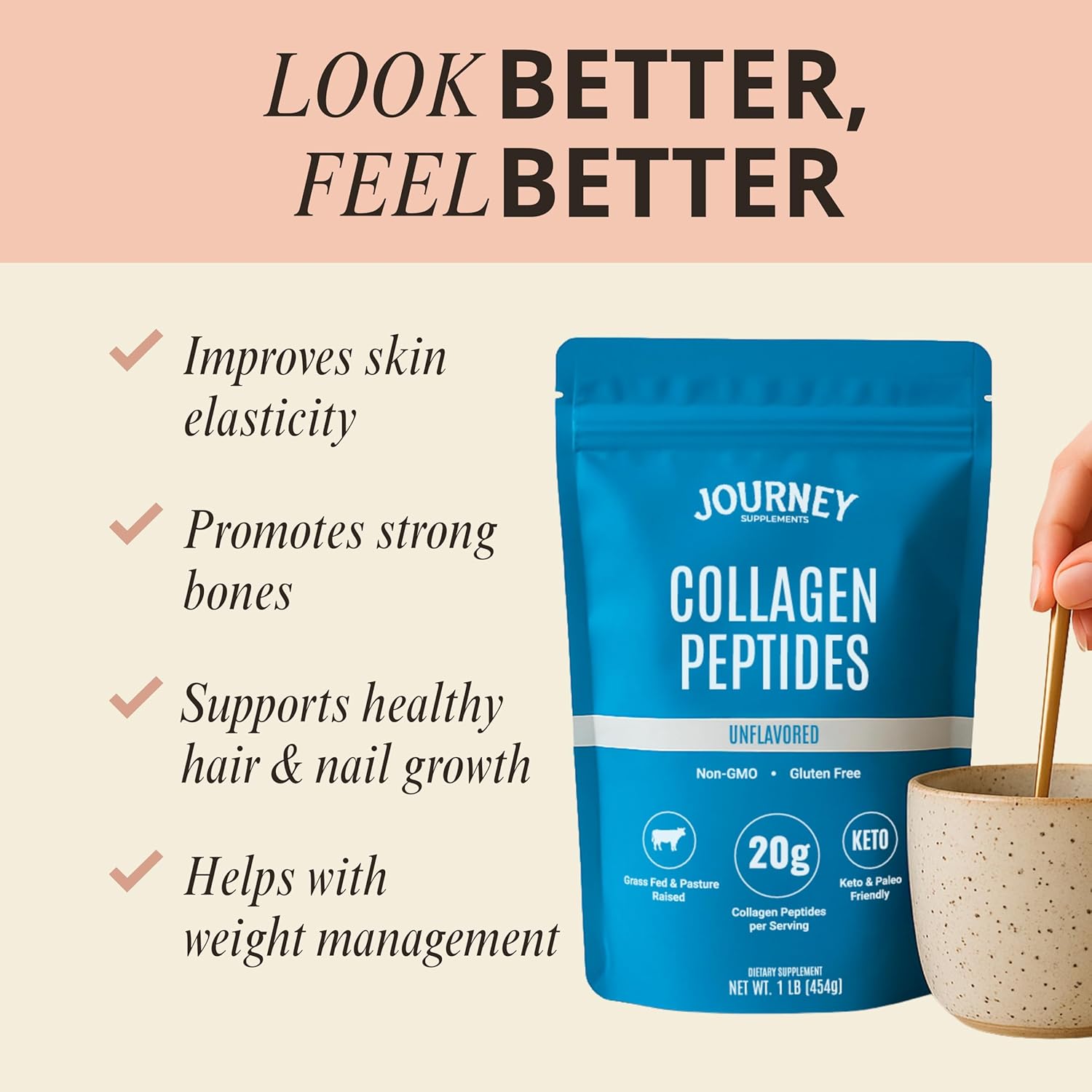 Iâve been using Journey Supplements Collagen Peptides in my coffee every morning, and itâs an easy, no-hassle addition to my routine. It mixes effortlesslyâno clumps, no gritâjust a smooth blend that disappears into my coffee without altering the taste.The best part? The quality is just as good as some of the more familiar, higher-priced brands, but at a much better value. Iâll definitely be sticking with this one. Highly recommend!