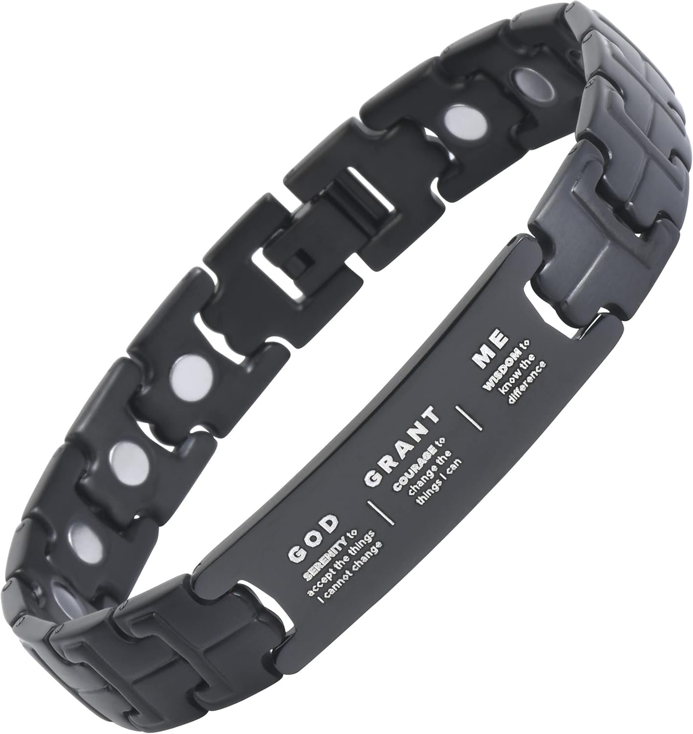 Crosstraxx Serenity Prayer Bracelet – Titanium Magnetic weighs just over 1 oz. The magnets are strong enough to hold the bracelet on fridge with ease. The links are easy to change with the included tool. The “God grant me” is big enough to read but rest is too small for my older eyes to read easily.
