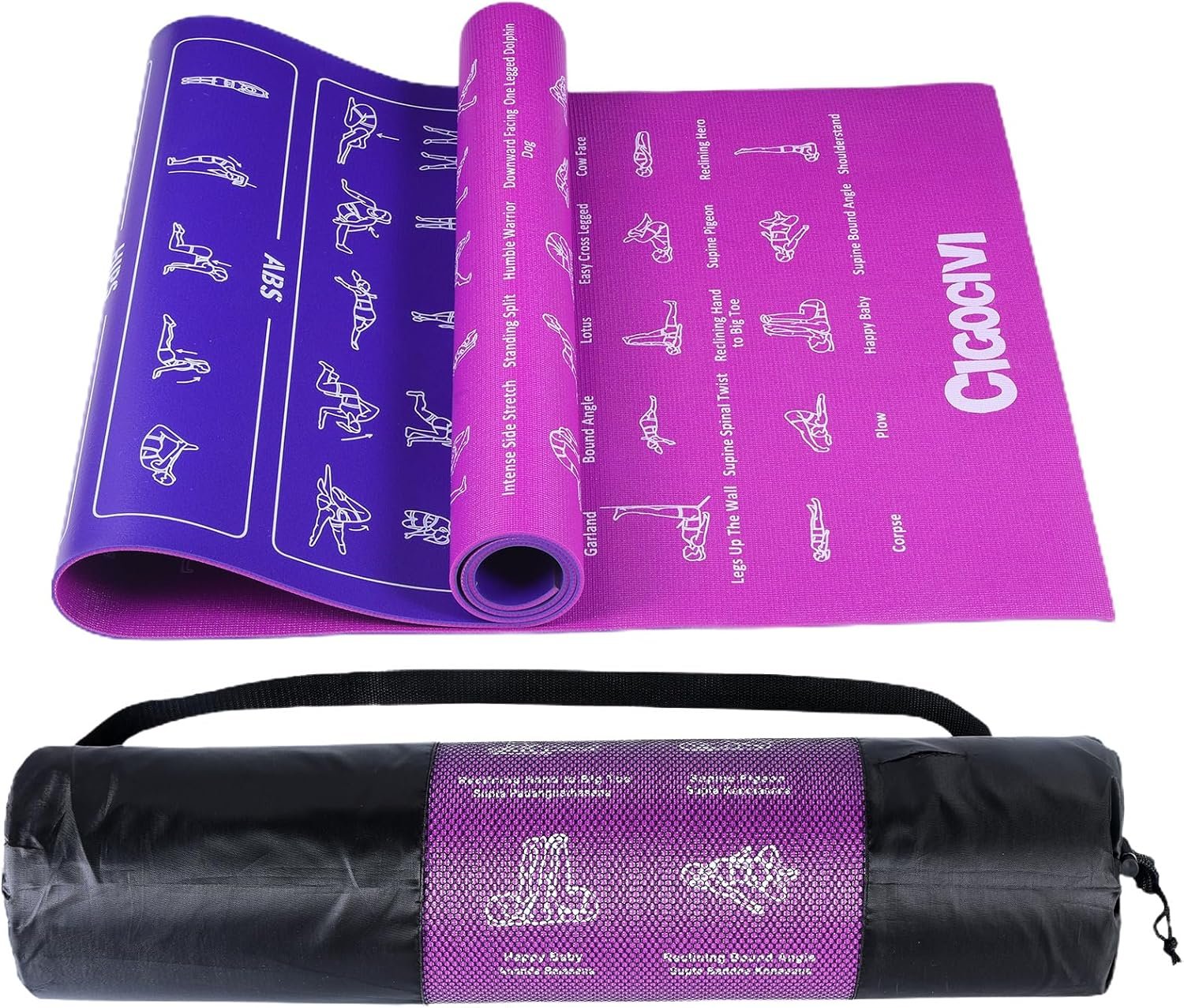 Enhance your yoga practice with this instructional yoga mat featuring 75 illustrated poses and 75 stretching exercises, perfect for beginners. The 1/4” thick, non-toxic, and non-slip surface ensures safety and comfort during workouts at home or outdoors. Ideal as an exercise mat for home workout or fitness routines